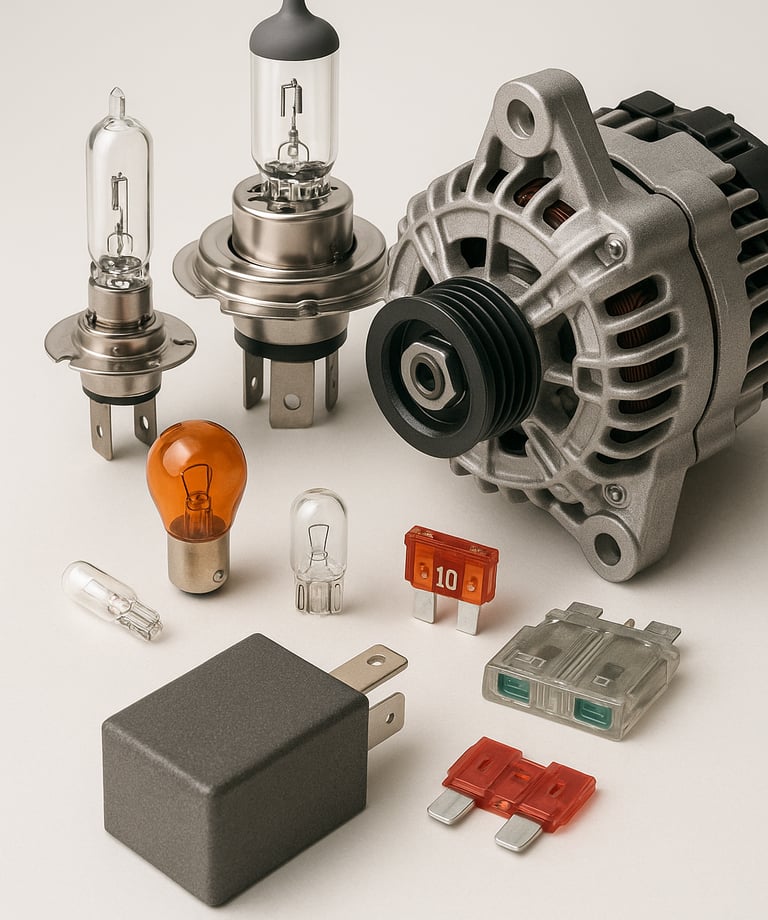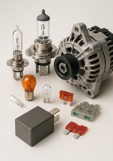 Lampu, relay, sensor, dan aksesoris lainnya untuk kebutuhan elektrik dan estetika kendaraan.